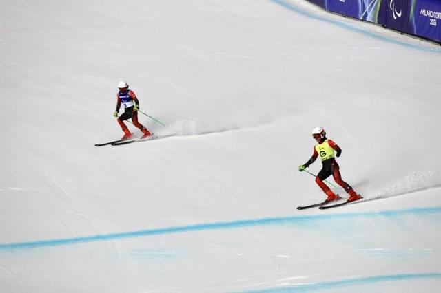 “左”“右”“压”……中国残奥高山滑雪领滑员陈治成通过头盔内的蓝牙耳机给残奥高山滑雪运动员王行懂精准播报雪道情况。